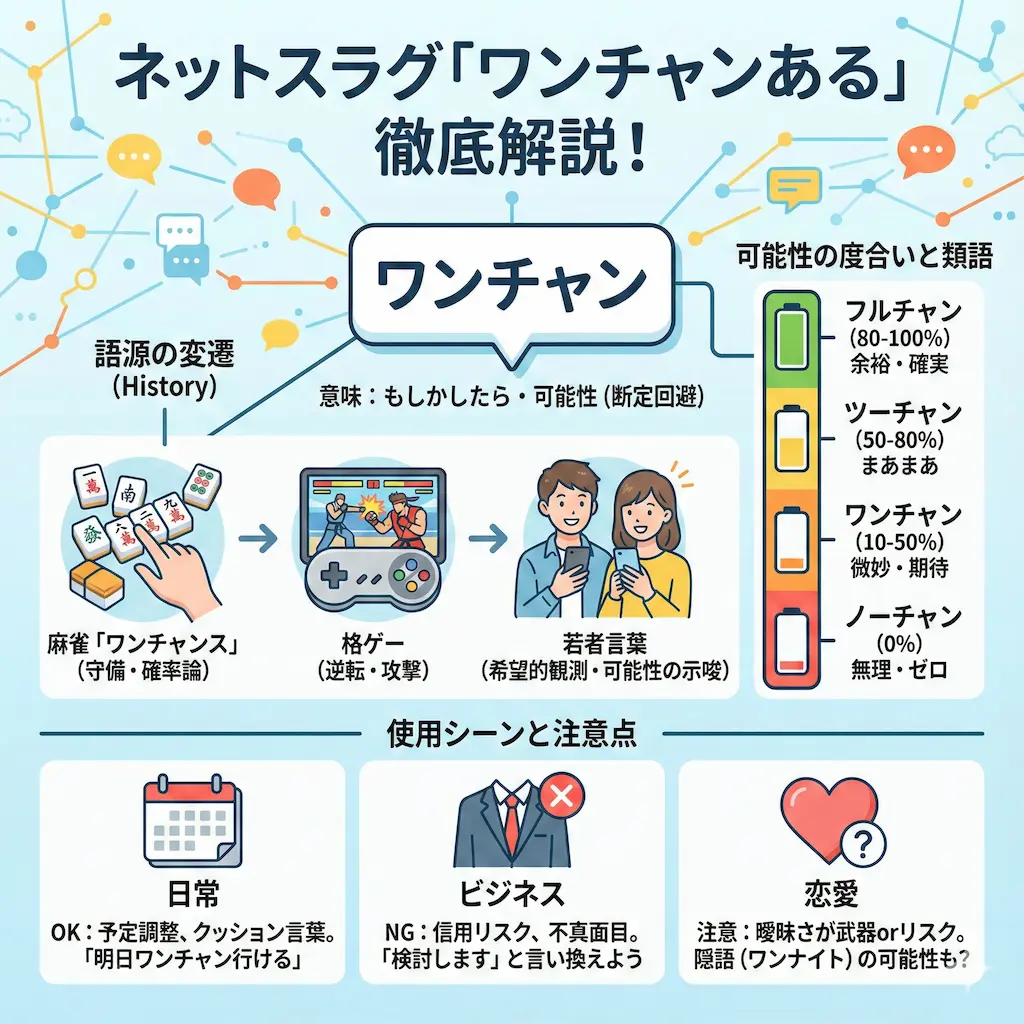 最近、街中やSNSで「ワンチャン」という言葉を耳にする機会が増えました。私がこの言葉に興味を持ったのは、若者だけでなく幅広い世代が使い始めていることに気づいたからです。 この言葉は単なる流行語ではなく、現代社会のコミュニケーションを円滑にする便利なツールとして機能しています。本記事では、ワンチャンの正しい意味や意外な語源、そして使う際の注意点を分かりやすく解説します。 ワンチャンの本来の意味と正しい使い方|基礎知識 ワンチャンとは「ワンチャンス」の略語であり、主に「もしかしたら」「可能性がある」という意味で使われます。私が普段の会話で耳にする際も、確率は低いけれどゼロではないというニュアンスを含んでいることが多いです。 この言葉は、断定...