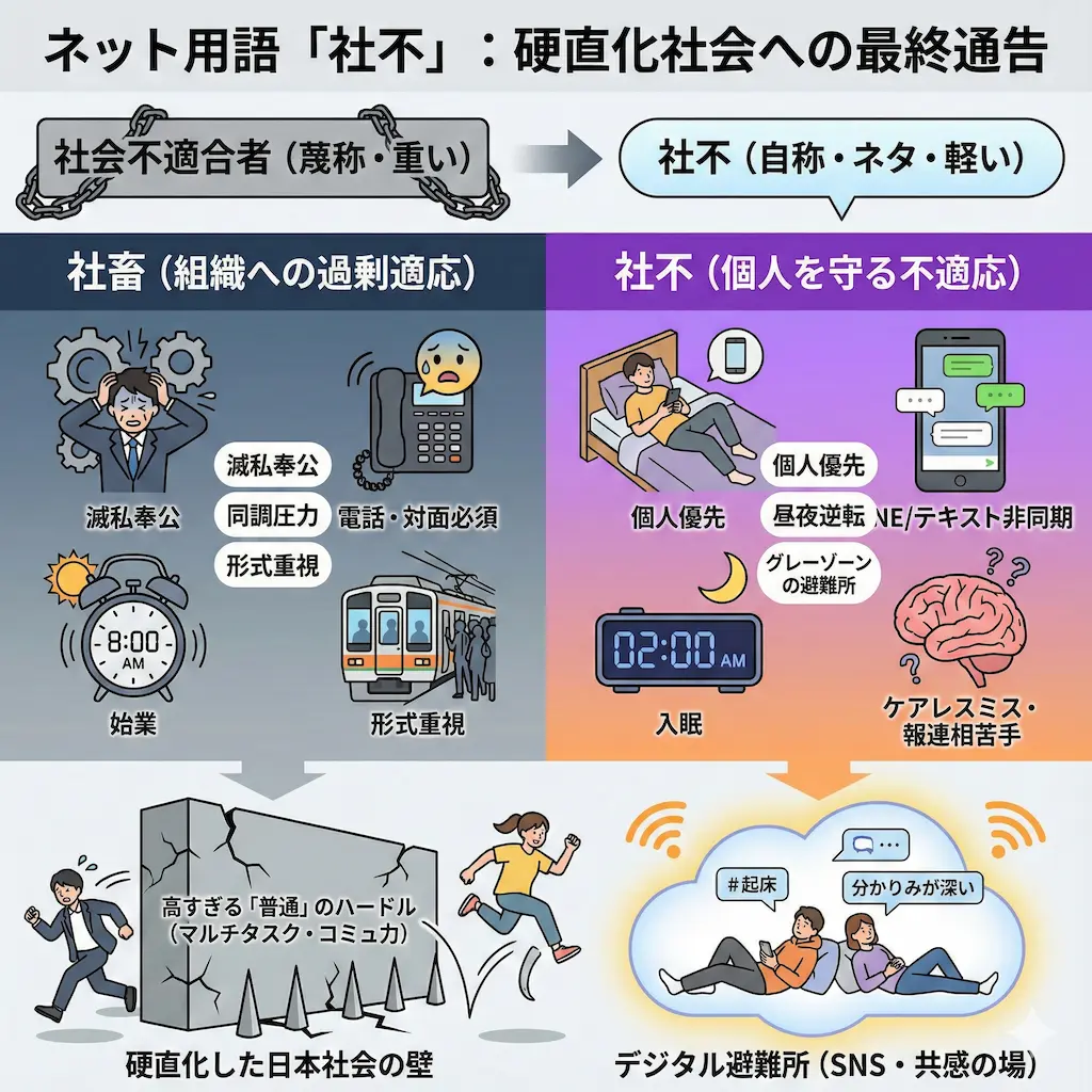 近年、SNSを中心に「社不(しゃふ)」という言葉を目にする機会が爆発的に増えました。私がこの言葉に注目するのは、単なる若者言葉としての流行を超えた、ある種の社会現象を感じるからです。 ここでは、元々は差別的なニュアンスを含んでいたこの言葉が、なぜ若者のアイデンティティとして定着したのかを深掘りします。現代社会が抱える構造的な問題と、そこから逃れようとする人々の心理を紐解いていきましょう。 「社不」という言葉の変遷と定義 もともと「社会不適合者」という言葉は、非常に重く、相手の人格を否定するような強い響きを持っていました。しかし、現代のネット空間においては、その意味合いが大きく変化しています。 私が観察する限り、この言葉はもはや単なる蔑称...