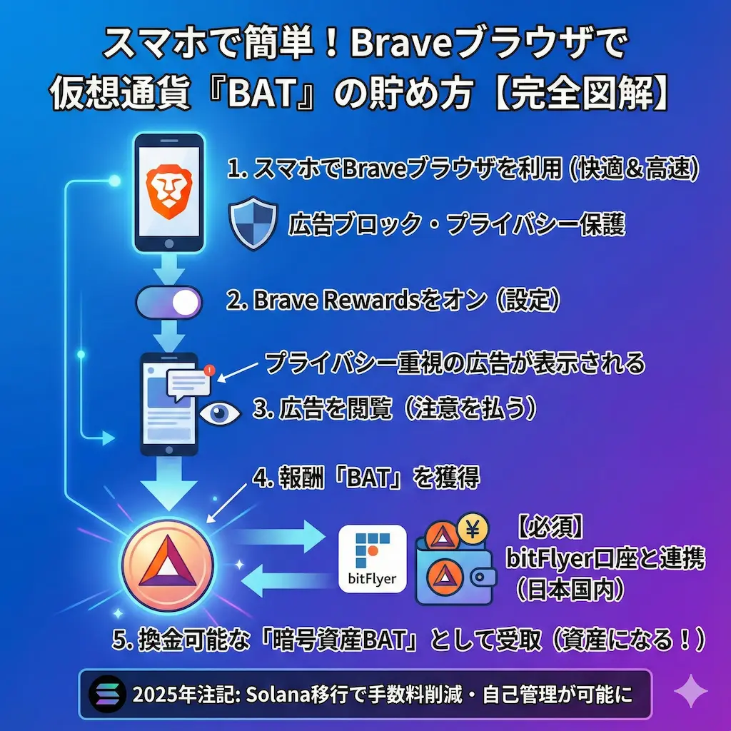 2025年のアップデートで最も注目すべきは、報酬の「セルフカストディ(自己管理)」化です。これまでは取引所などが仲介していましたが、今後はユーザー自身のSolanaウォレット(PhantomやBrave Wallet)で直接BATを受け取れるようになります。