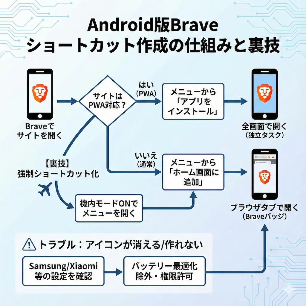 Android版Braveでのショートカット作成は、一見するとChromeと同じように見えますが、その裏側にはプライバシー重視の独自仕様が隠されています。PWAサイトが強制的にアプリ化される挙動や、特定の端末でアイコンが消える問題も、仕組みを知っていれば対処できます。