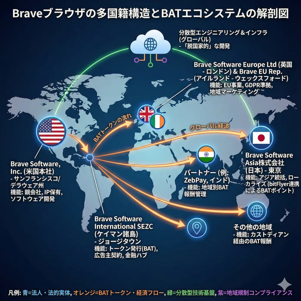 Braveはアメリカ企業ですが、世界各国の法律に対応するために非常に複雑かつ巧妙な運営体制を敷いています。私が調査して驚いたのは、日本市場に対する本気度です。