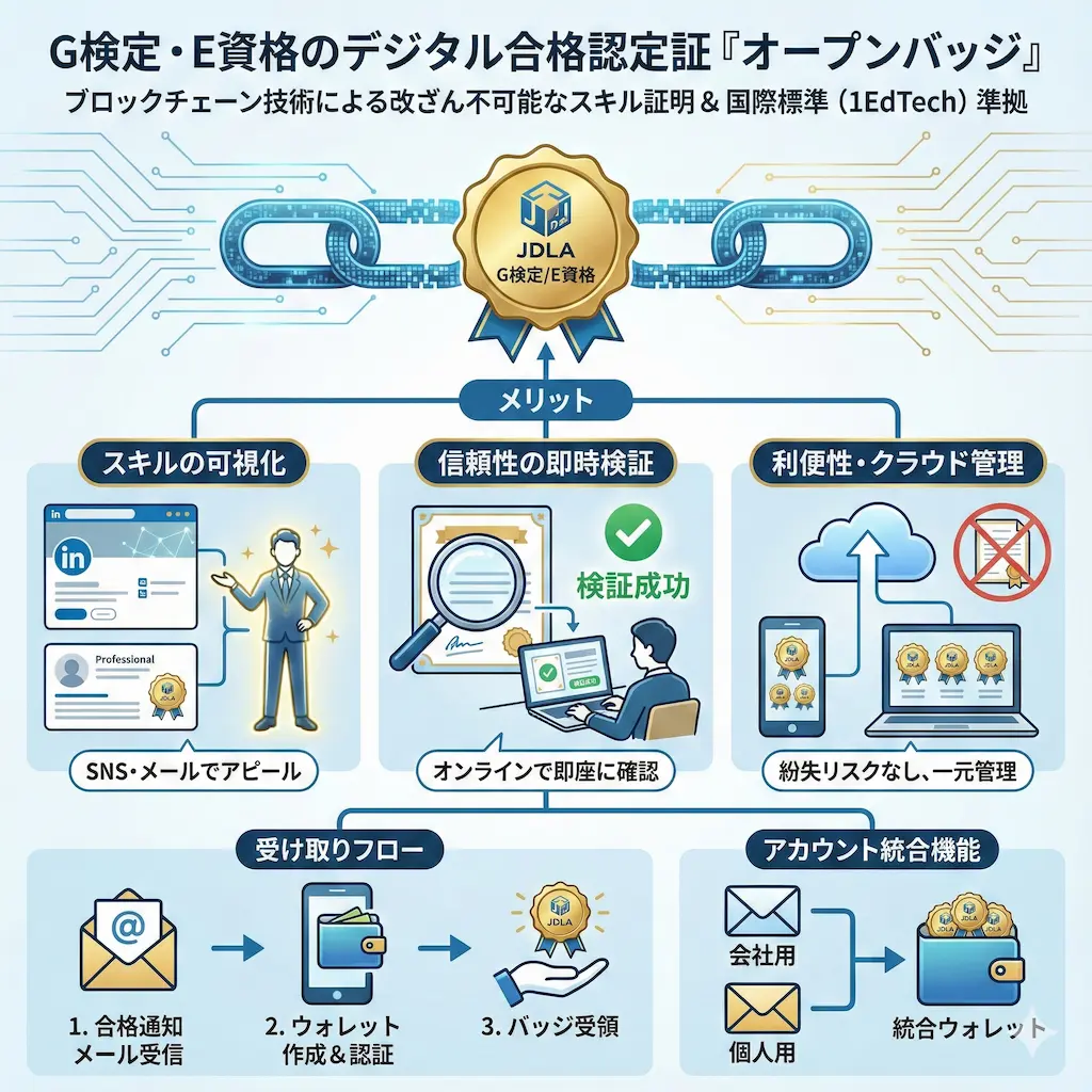 日本ディープラーニング協会(JDLA)は、2021年10月からG検定およびE資格の合格者に対してオープンバッジの発行を開始しました。これは日本のDX推進やデジタルの日に合わせた戦略的な動きであり、資格の価値をデジタル空間で最大限に高めるための施策です。