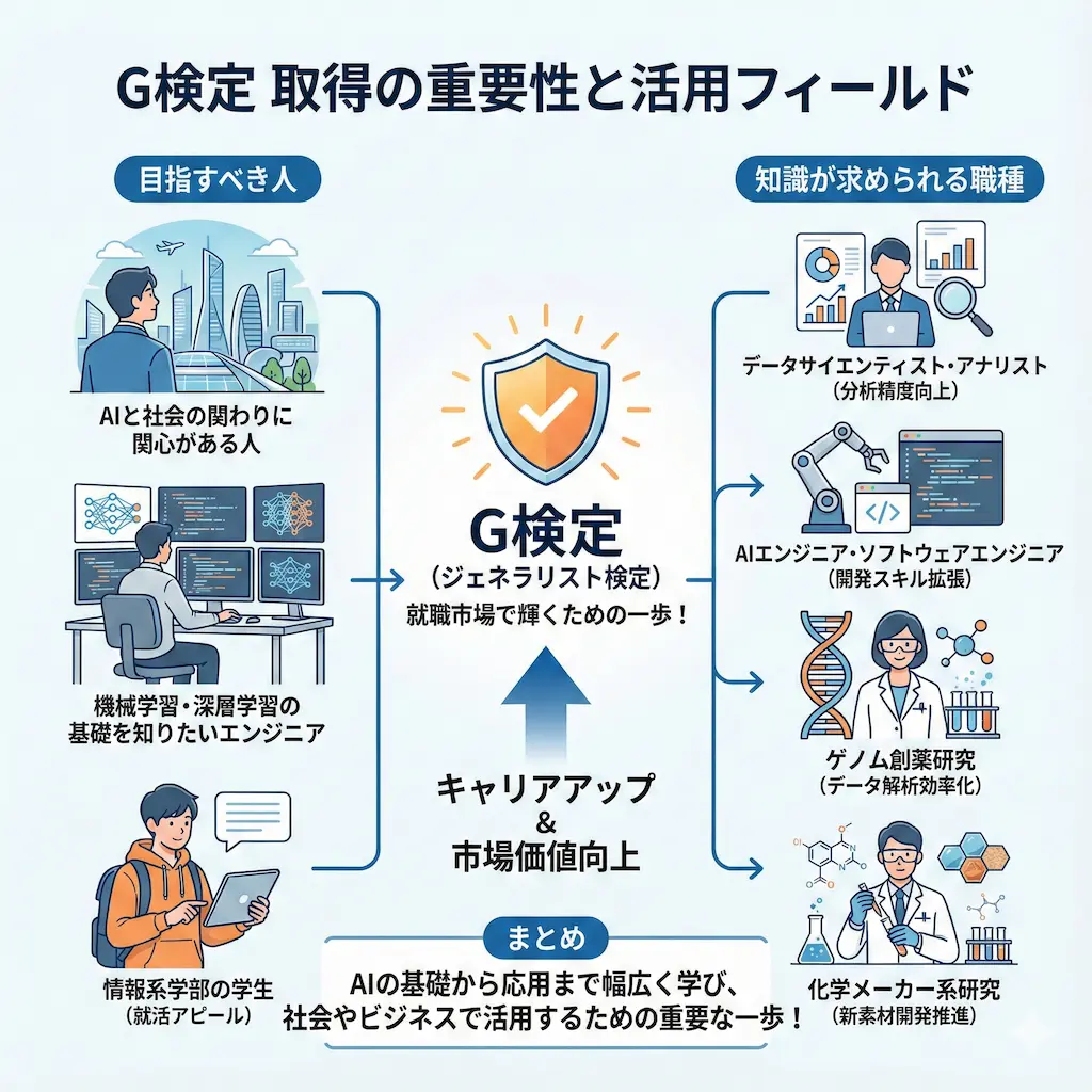 これからの時代、AIは「作るもの」から「使うもの」へとシフトします。しかし正しく使うためには、裏側の仕組みやリスクを知らなければなりません。G検定への挑戦は、AIと共生する未来への確実な投資となります。