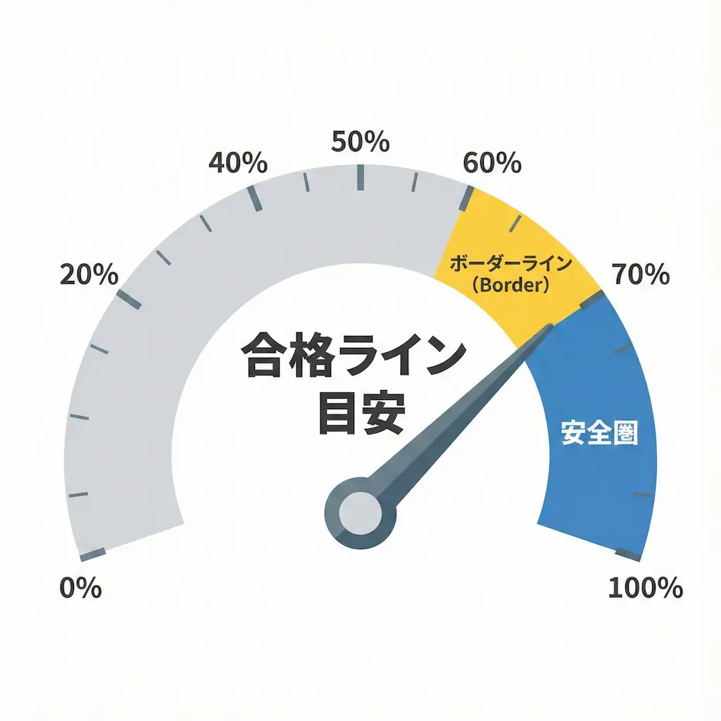 多くの教育機関や過去の受験者のデータを見ると、全体の7割(70%)以上を得点できれば、ほぼ確実に合格できています。一方で、難易度が高い回では60%台半ばでも合格している事例が確認されています。