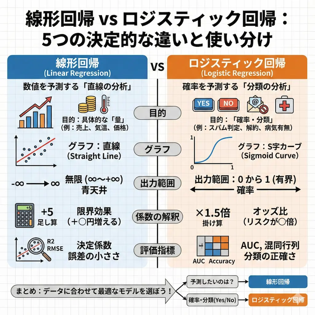データ分析や機械学習を学び始めると、必ず直面する壁があります。それが「線形回帰とロジスティック回帰、どっちを使えばいいの?」という疑問です。