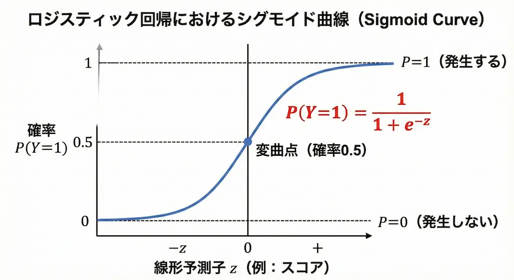 ロジスティック回帰で使われるシグモイド関数は、どんなに大きな入力値があっても1に近づくだけで1を超えず、どんなに小さな値でも0を下回りません。私がこのカーブを初めて見たとき、現実世界の「ある程度勉強すると急に点数が伸び、やがて頭打ちになる」という現象をうまく表していると感じました。