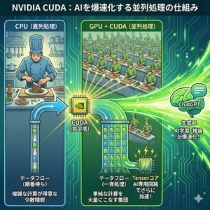 CUDAはNVIDIAが提供する独自の並列コンピューティングプラットフォームです。AI開発におけるデファクトスタンダードとして長年君臨しています。
